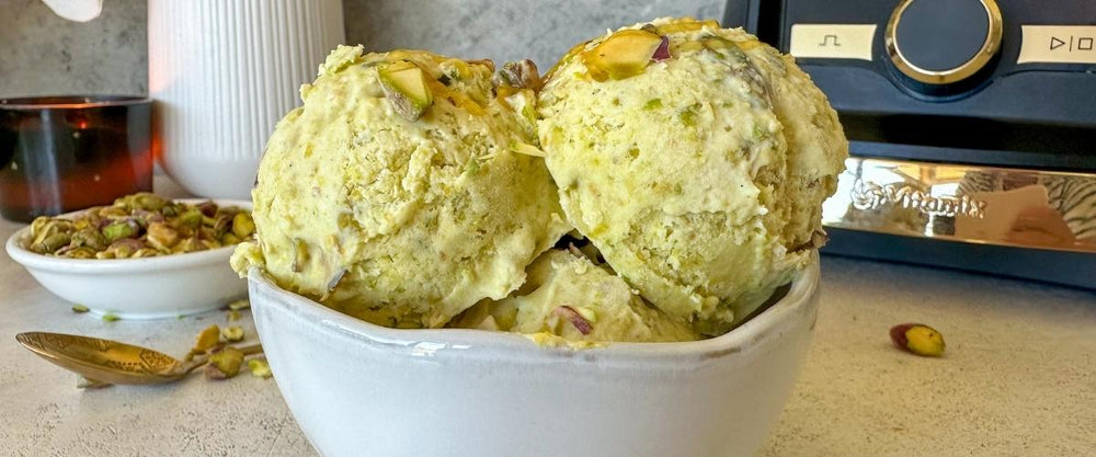 - First make pistachio paste by blending pistachios and maple syrup at speed 10 for 5 minutes. Ensure to use the tamper.