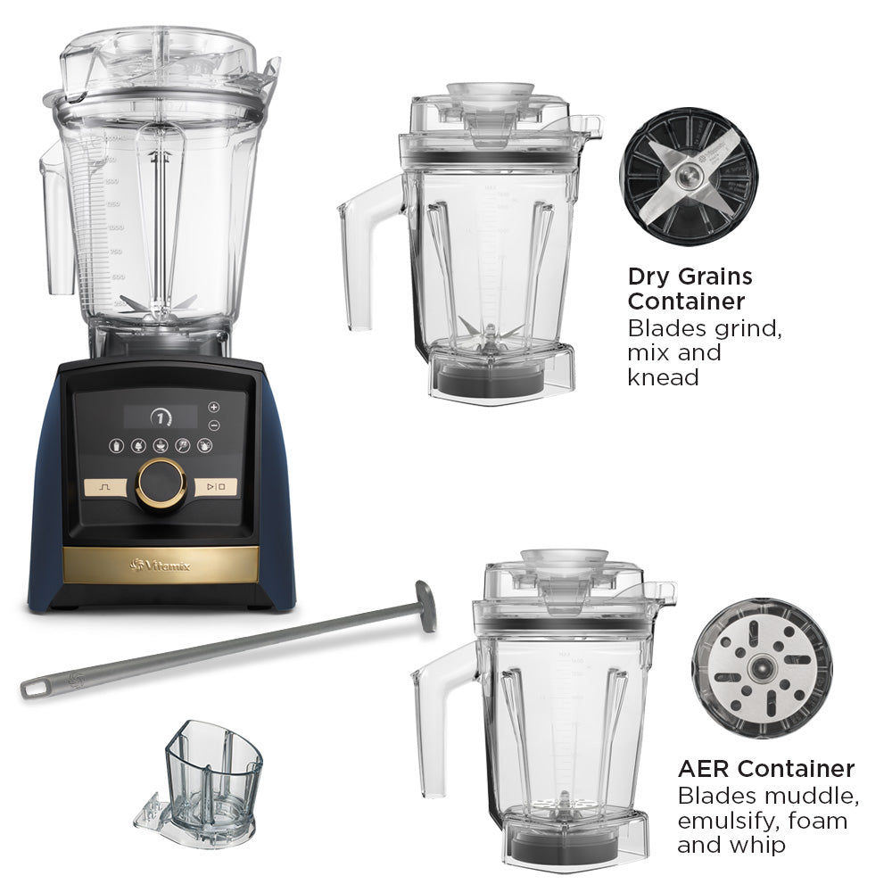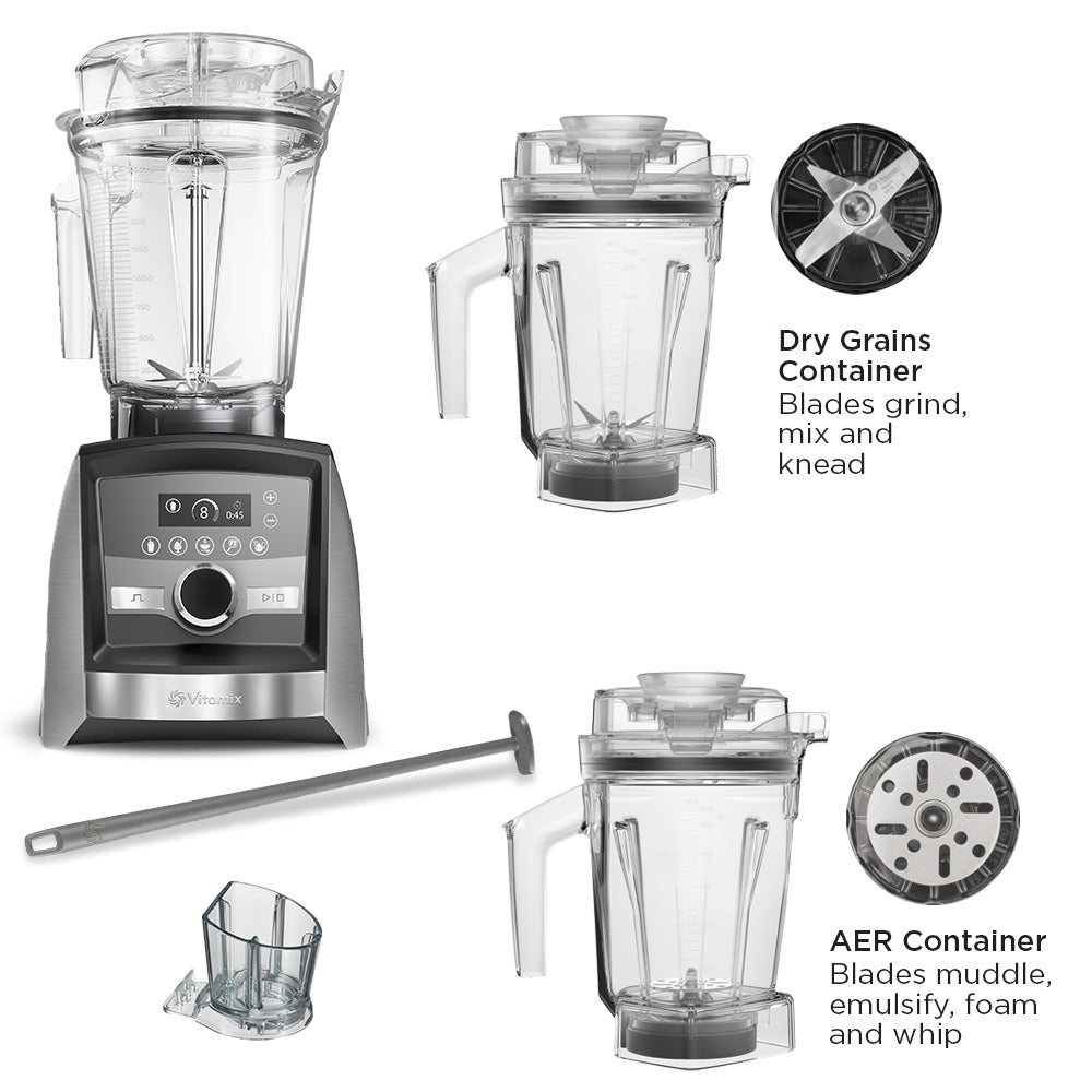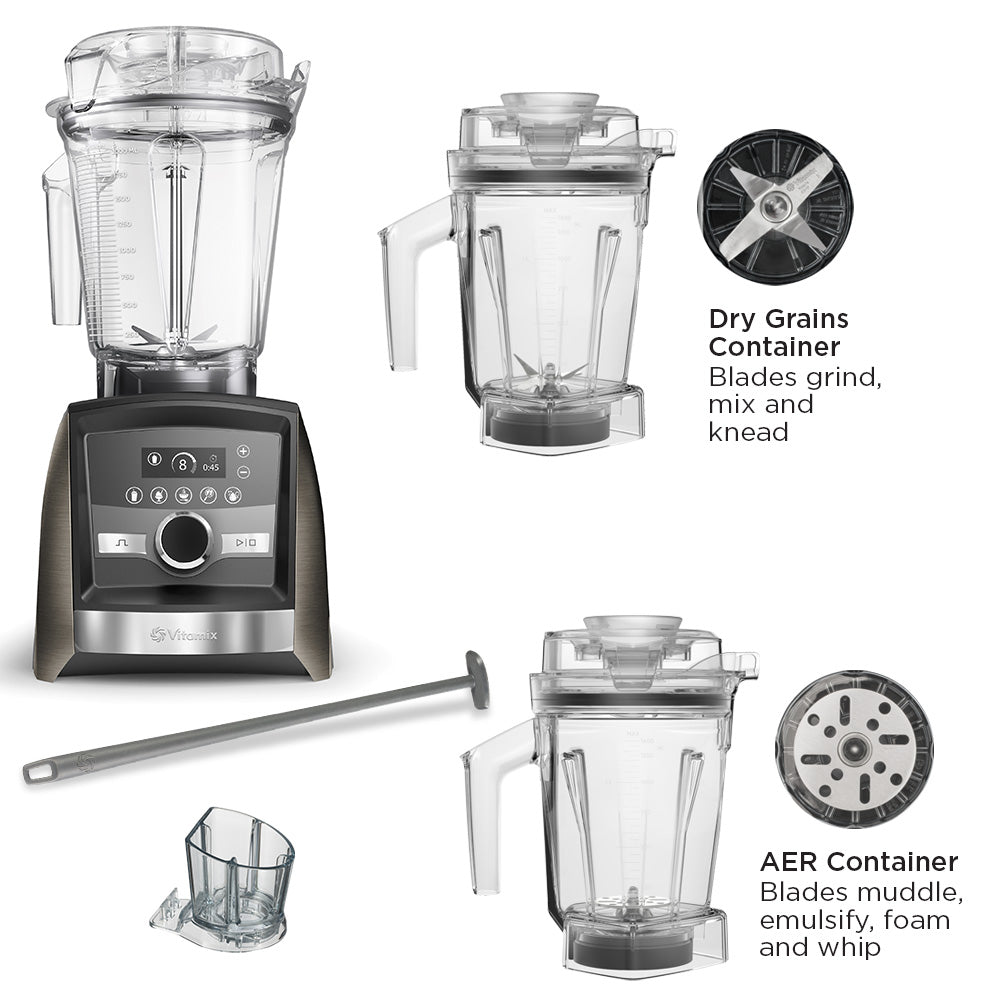 Bundle Contents: Motor Base, One Low-Profile 2.0-litre Container, One 1.4-litre Ascent Dry Grains Container, One 1.4-litre Ascent Wet Container, One 1.4-litre Ascent Aer Disc Container, Under Blade Scraper, Tamper Holder, S2 Low-Profile Tamper